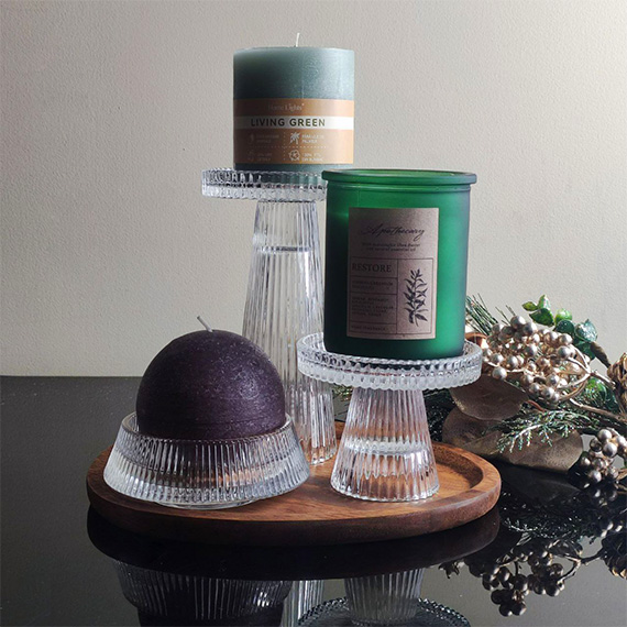 Стеклянный подсвечник очень освежает современные интерьеры, хорошо сочетается на контрасте с металлическими и деревянными элементами декора.